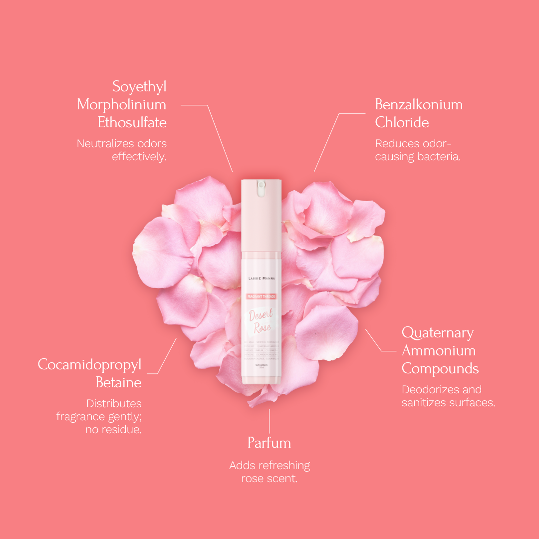 Lassie Manna Fragrant Threads –Desert Rose is a versatile fragrance, deodorizing, wrinkle-removing, no-iron, no-wash fabric spray; designed for clothing, mattresses, fabric sofas, hard surfaces, cabinets, and indoor spaces. Infused with a sweet Rose scent, it effectively breaks down and eliminates unwanted odors such as sweat, smoke, mustiness, and cooking fumes. It also helps remove wrinkles formed on clothing. The result is a clean, fresh, and pleasantly fragrant environment that enhances your comfort and daily living experience.