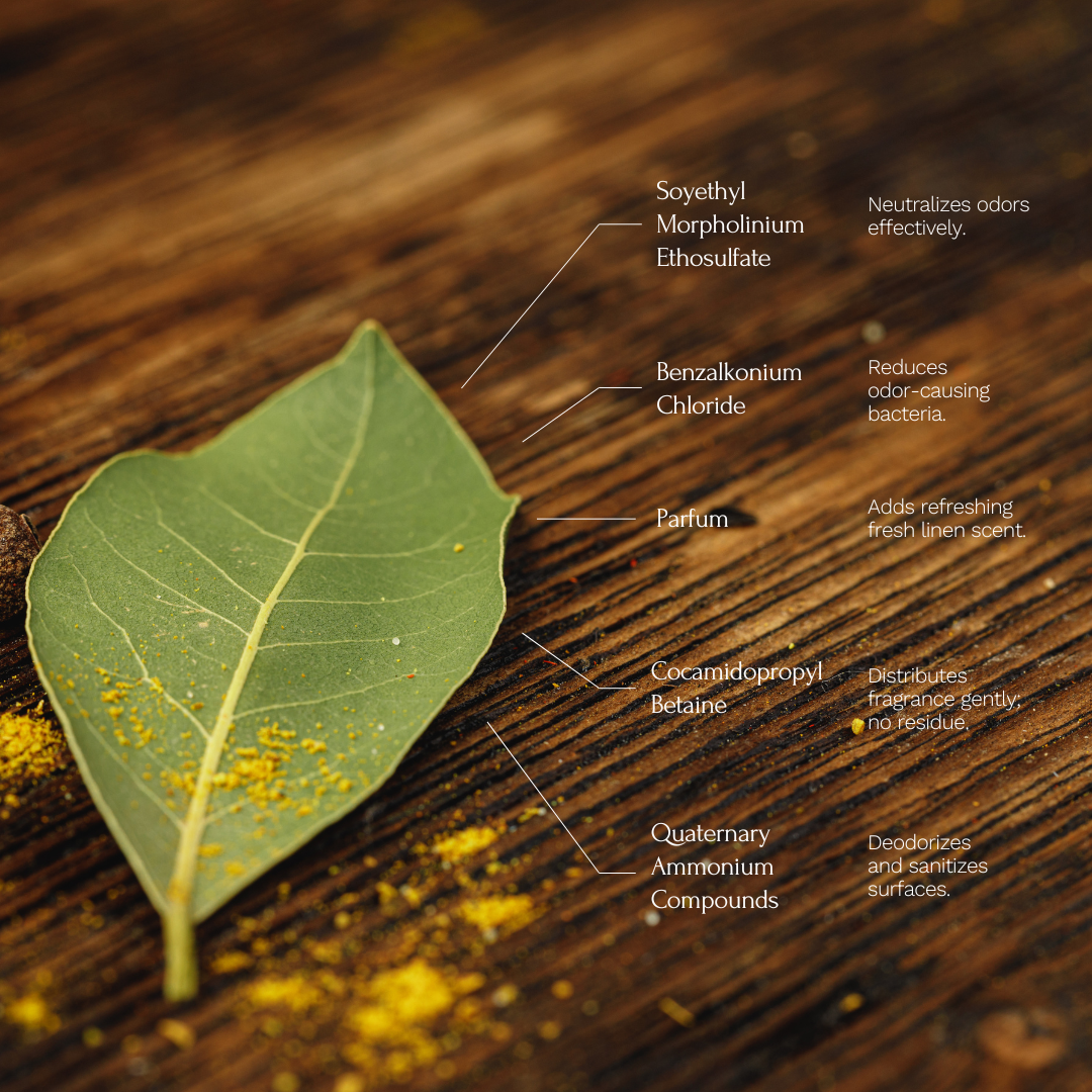 Formulated with Soyethyl Morpholinium Ethosulfate and Quaternary Ammonium Compounds, this spray works to neutralize and break down odor-causing molecules, ensuring long-lasting freshness. Benzalkonium Chloride adds antimicrobial protection to reduce bacterial buildup on fabrics and surfaces. Gentle surfactants like Cocamidopropyl Betaine and C12-13 Pareth-9 aid in even distribution of fragrance while preventing residue, and the added Parfum delivers a refreshing fresh linen scent that uplifts the atmosphere.