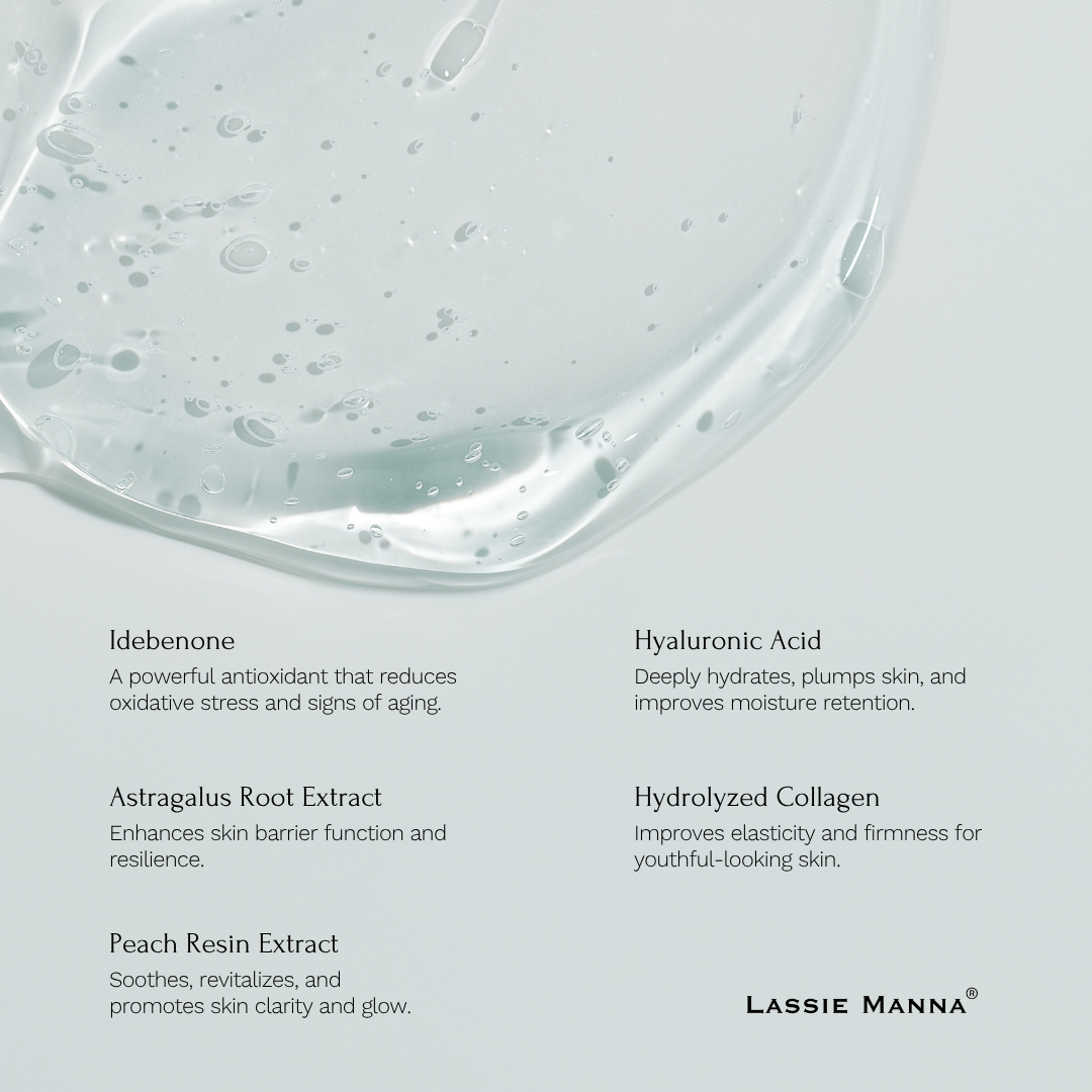 This emulsion combines Idebenone, a potent antioxidant that protects against environmental damage and premature aging, with hyaluronic acid for deep hydration and plumping. Astragalus membranaceus root extract enhances skin resilience, while hydrolyzed collagen helps improve firmness and elasticity. Additional natural extracts such as peach resin and paeonia root provide soothing and revitalizing benefits, creating a comprehensive anti-aging formula.