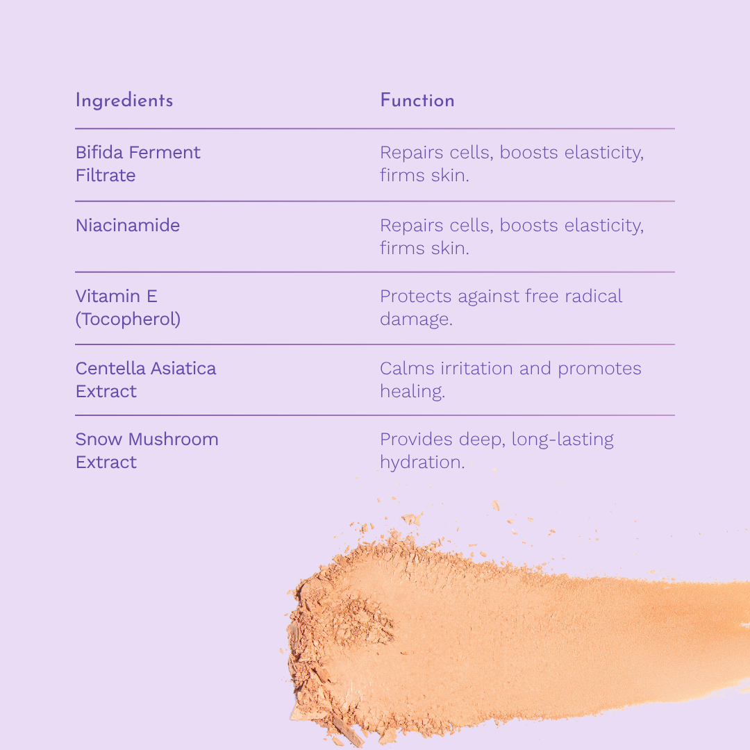 Formulated with Bifida Ferment Filtrate for skin repair and resilience, Niacinamide for brightening and evening out skin tone, and Vitamin E (Tocopherol) for antioxidant protection. Botanical extracts such as Centella Asiatica and Aloe Vera soothe and hydrate, while Snow Mushroom Extract provides deep, long-lasting moisture for a radiant glow.