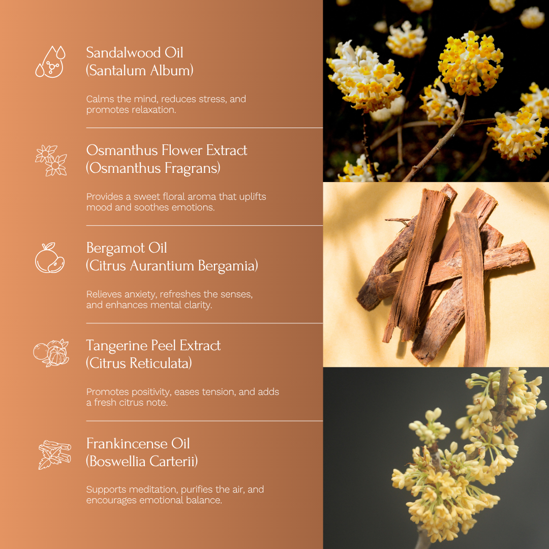 This candle is enriched with sandalwood oil, known for its grounding and calming properties that reduce stress and promote relaxation; osmanthus extract, prized for its sweet, floral aroma that enhances mood and emotional balance; bergamot and tangerine oils, which offer refreshing citrus notes while helping to relieve anxiety and uplift mental clarity; and frankincense oil, renowned for its meditative and purifying qualities. Together with agarwood extract, these ingredients create a sophisticated scent profile that relaxes the mind and body while supporting emotional well-being.